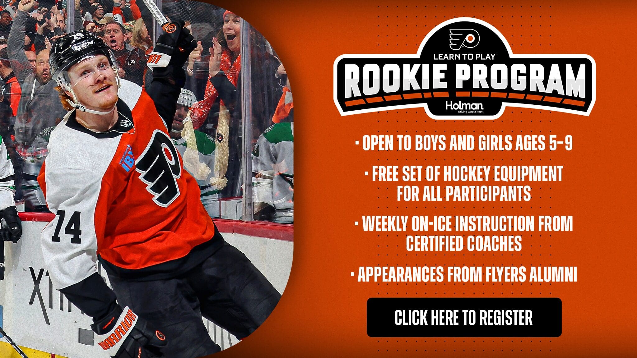 • Introduce your child to the exciting world of hockey with the Flyers Learn to Play Rookie Program. Designed for boys and girls ages 5-9, this program provides weekly on-ice instruction that focuses on the fundamental skills of hockey. Each participant receives a complete set of head-to-toe equipment, ensuring they are ready to hit the ice in style and safety.